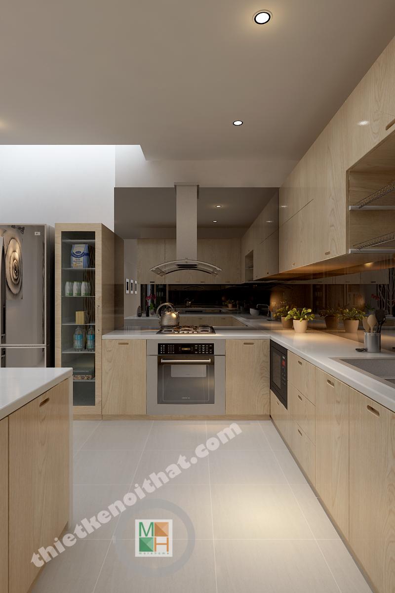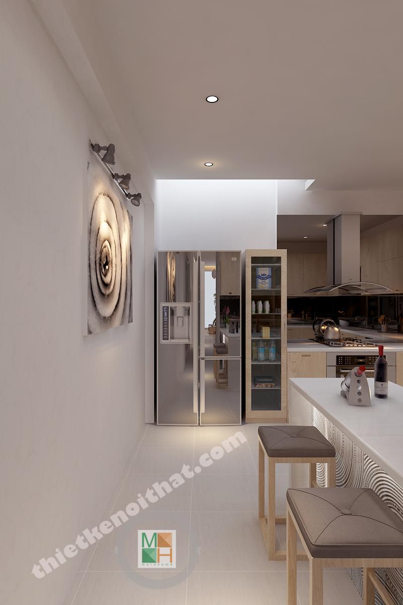 Căn bếp được trang bị hiện đại vơi đầy đủ các thiết bị nấu nướng như tủ lạnh, lò nướng và lò vi sóng. Hệ thống tủ bếp làm bằng gỗ sáng màu tạo cảm giác thân thiện khi sử dụng. Bàn soạn được kết hợp làm quầy bar, tạo ra một hệ tủ phía dưới rất tiện lợi. Mặt ngoài của bar được trang trí bằng những họa tiết đơn giản mà tinh tế.
