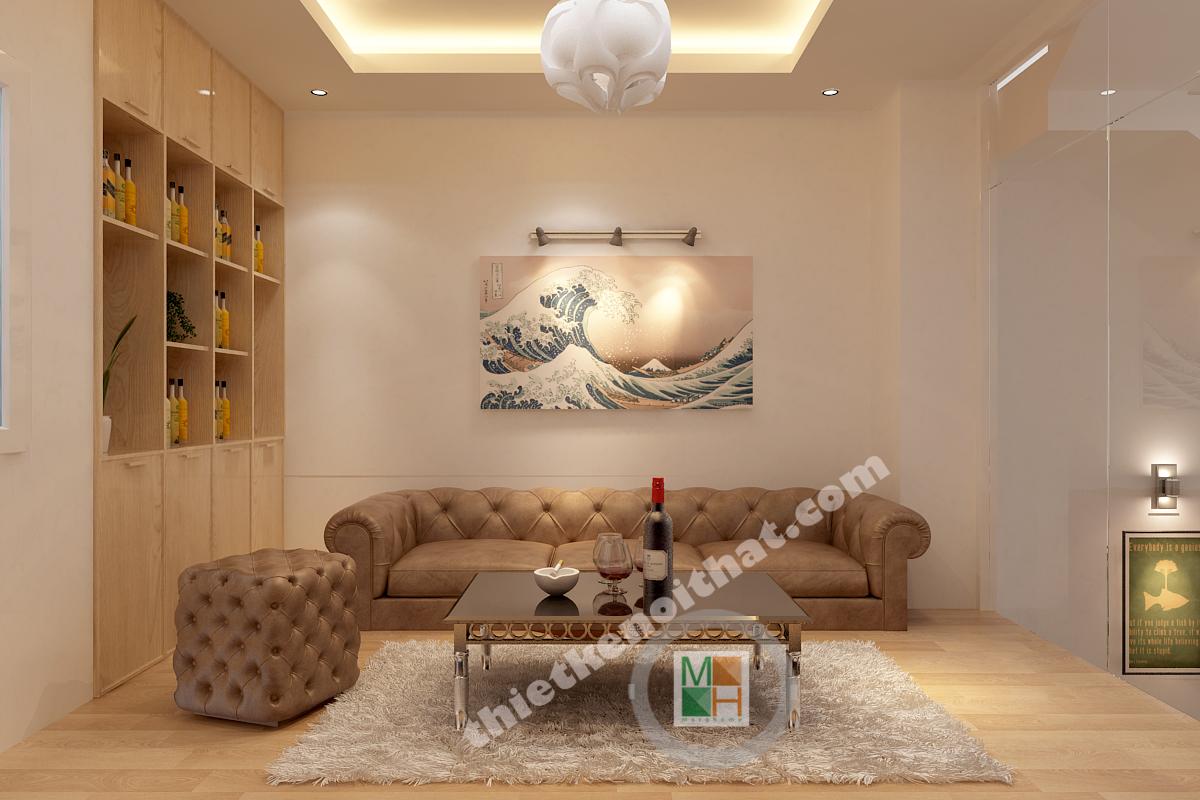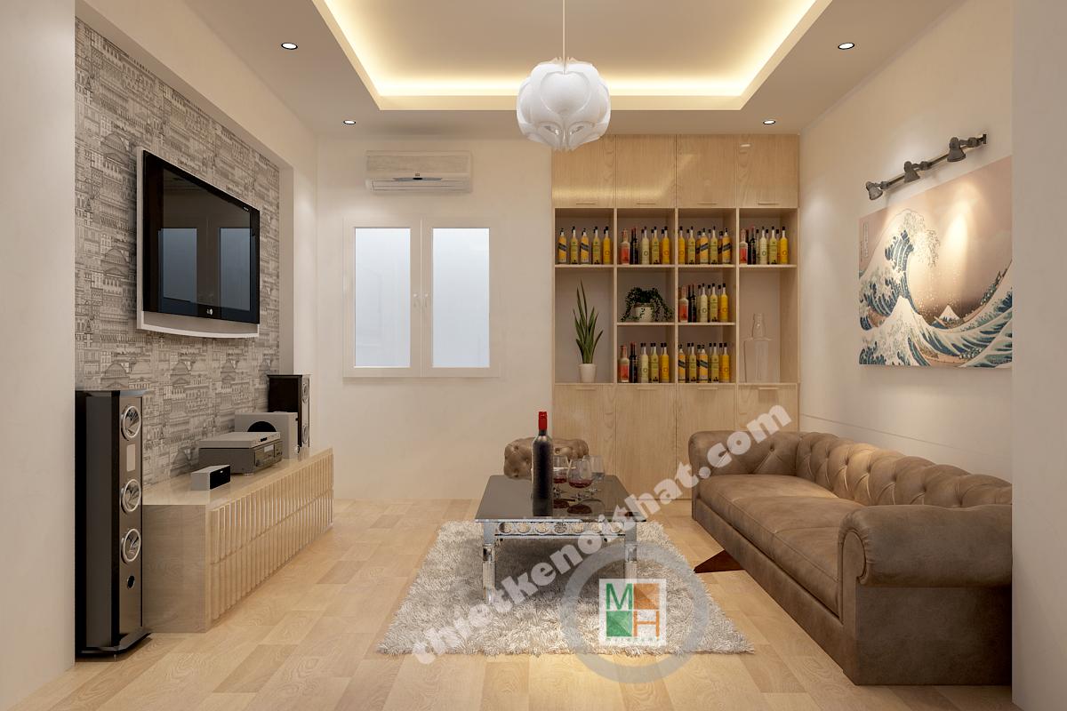 Khoảng đệm giữa tầng 1 với tầng 2 được tận dụng làm thành phòng giải trí chung cho cả gia đình. Vì không phục vụ tiếp khách nên phòng chỉ có một ghế sofa dài và một ghế phụ nhỏ để gia đình có thể quây quần ngồi xem tivi cùng nhau. Tủ rượu được thiết kế âm tường bên cạnh giúp gia chủ có thể trưng bày rượu quí và đơn giản hơn là uống cùng người thân.