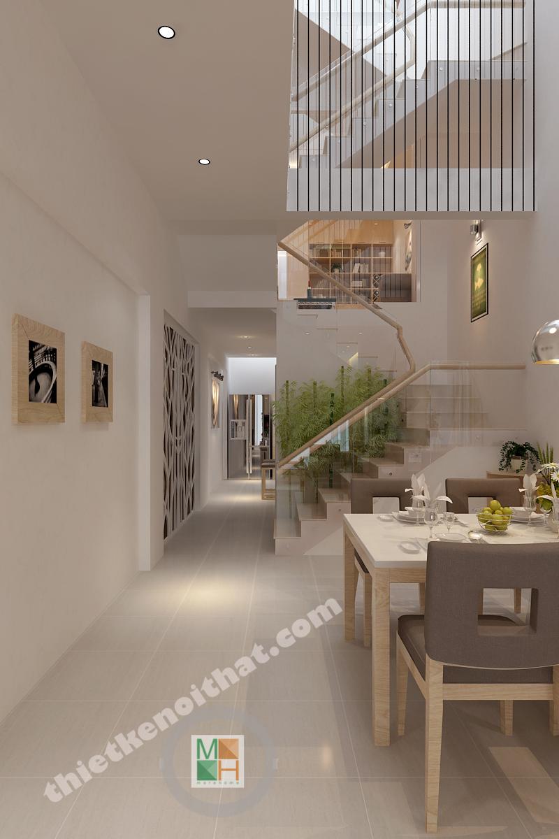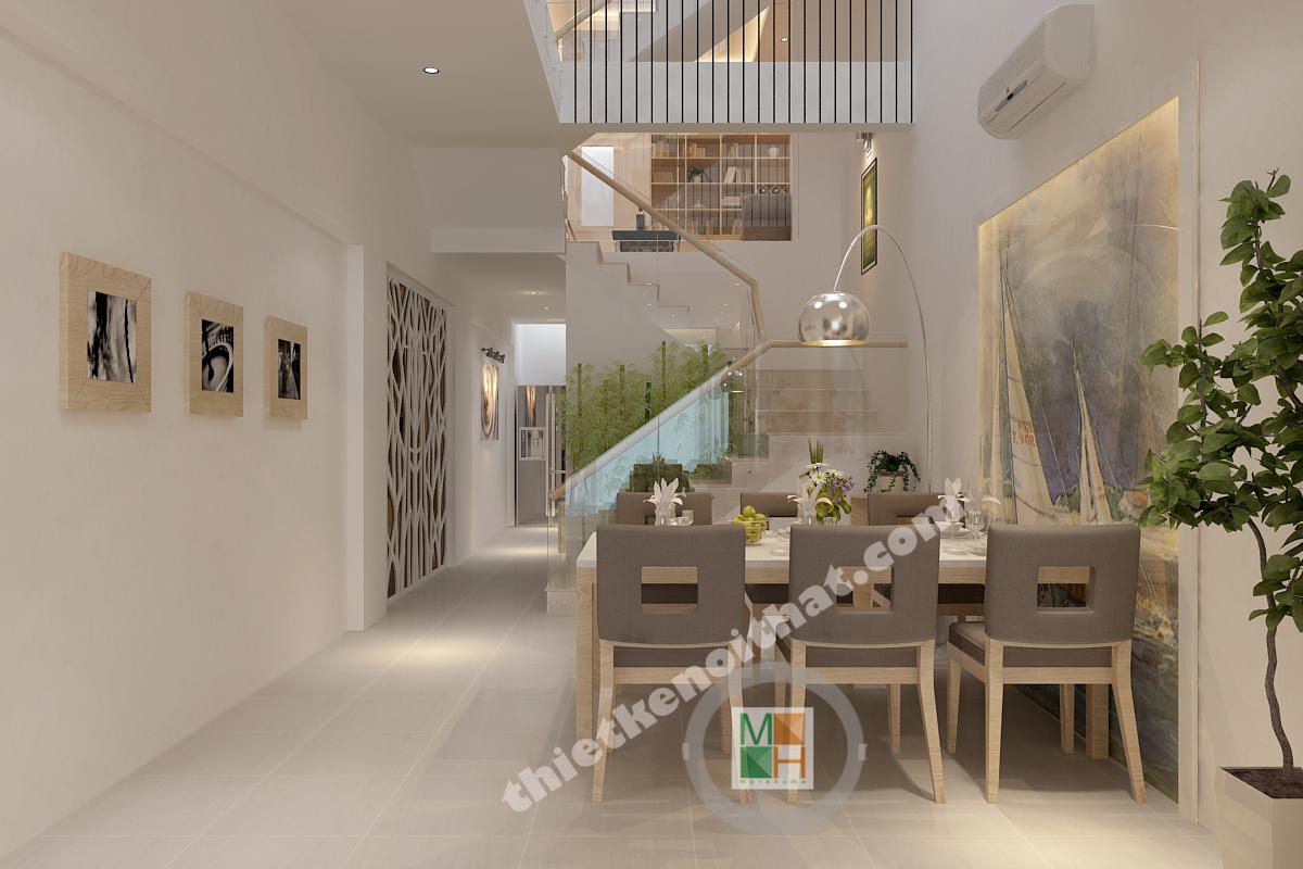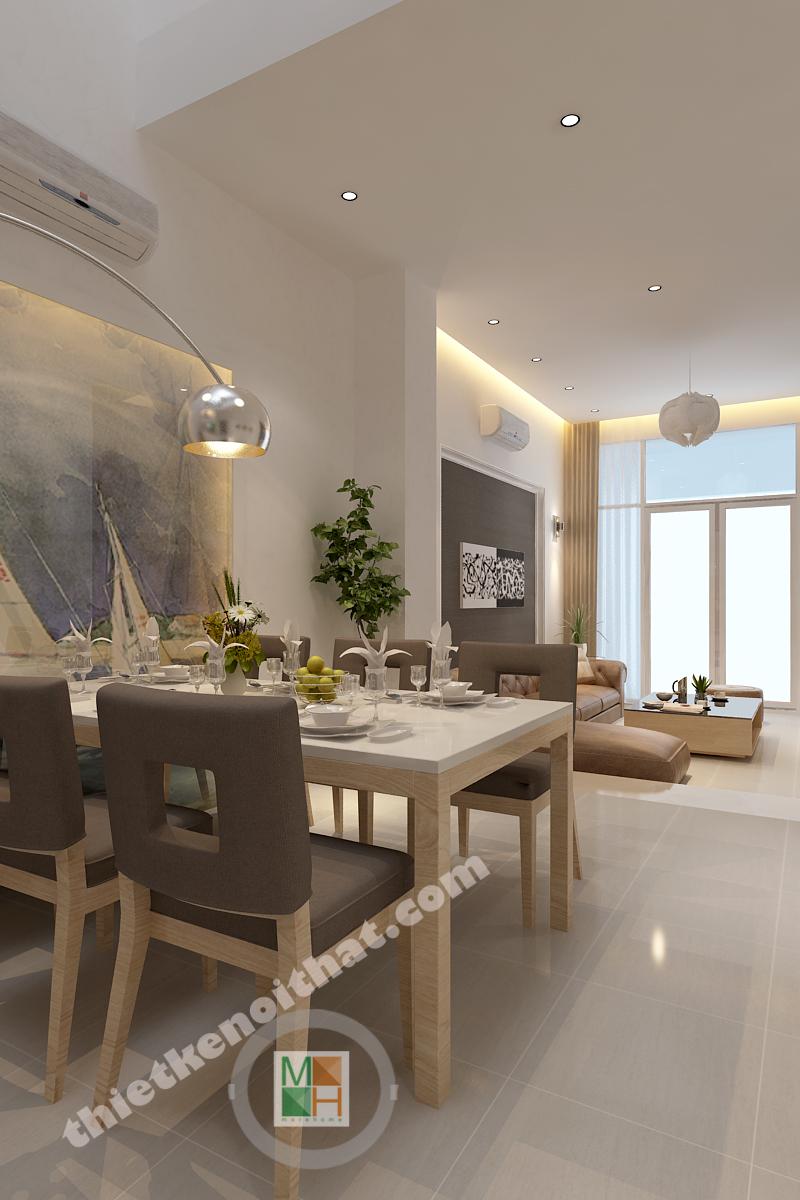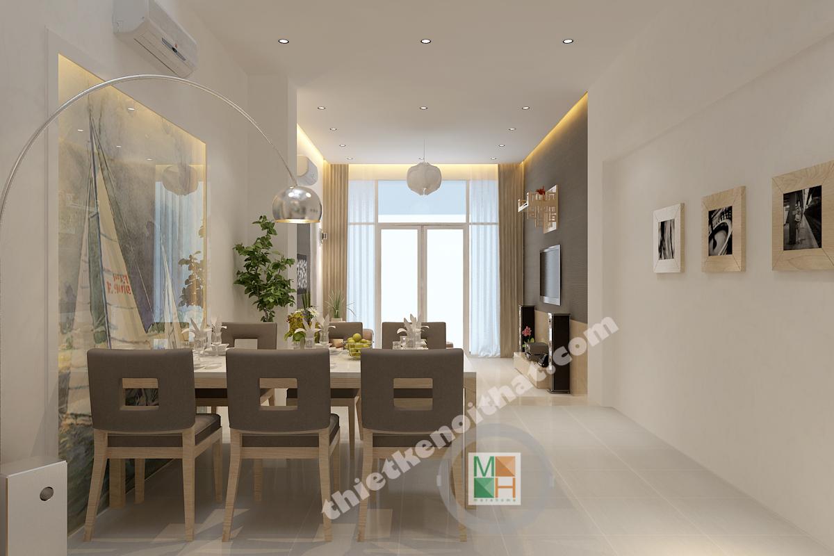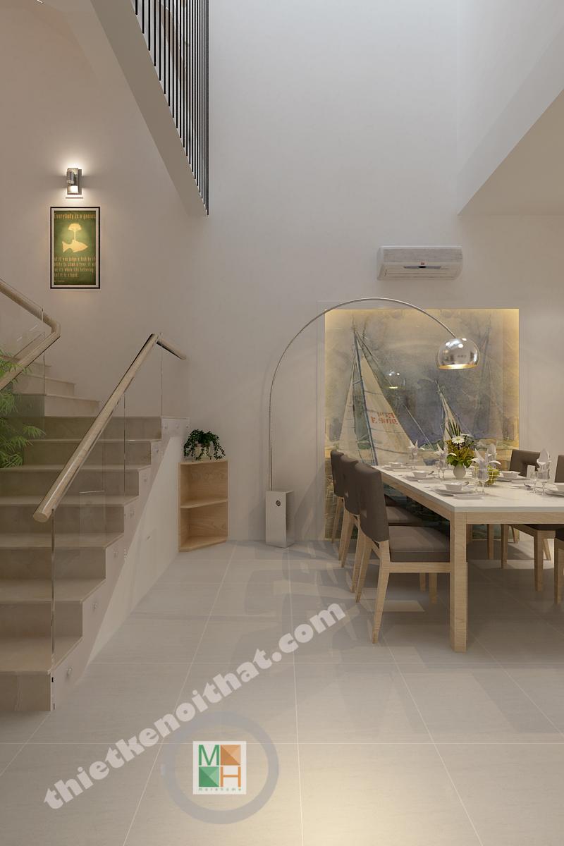 Bàn ăn được đặt ngay cạnh phòng khách nhằm tạo ra sự liên kết trong sinh hoạt. Bộ bàn ghế này cũng là gỗ giống như kệ tivi nhằm tạo ra sự thống nhất trong chất liệu. Vì phía trên bàn ăn không có trần nên đèn thả được thiết kế giống như những chiếc cột điện, vừa đảm bảo đủ ánh sáng mà cũng là một kiểu trang trí mới lạ. Mảng tường sát với bàn ăn có lắp một bức tranh kính để tạo không khí vui vẻ và giúp nhân đôi ánh sáng cho khu vực này. Hành lang dẫn từ bàn ăn vào bếp có bố trí dãy đèn downlight để khiến không gian sáng hơn và không có cảm giác gò bó.