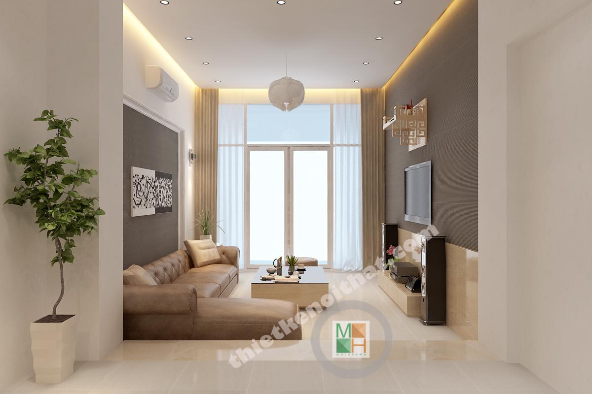 Màu sắc của nội thất phòng khách không sặc sỡ nhưng vẫn để lại được ấn tượng nhờ cách bài trí thông minh. Bộ sofa màu café và mảng tường ghi đằng sau tạo điểm nhấn và chiều sâu cho không gian. Bàn trà nhỏ gọn với mặt kính đen độc đáo. Có thể tô điểm thêm cho bức tường sofa dựa lưng thêm sống động bằng một bức tranh nghệ thuật nhẹ nhàng.