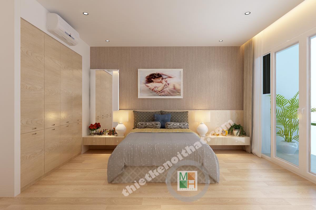 Phòng ngủ master không có diện tích quá lớn nhưng vẫn đảm bảo được sự thông thoáng nhờ hệ thống cửa kính hướng ra ngoài loggia. Vật liệu gỗ được sử dụng nhiều trong trang trí nội thất nên khi kết hợp với ánh sáng sẽ tạo ra một không gian ấm áp, gần gũi. Điểm nhấn của căn phòng nằm ở mảng tường vải phía đầu giường. Mảng tường có những rãnh nhỏ phía trên tạo thành một bông hoa cỡ lớn rất lãng mạn, đặc biệt là với những đôi vợ chồng trẻ. Bàn trang điểm và táp được thiết kế ngay cạnh đầu giường, tạo ra sự liên kết chắc chắn và tiện lợi khi sử dụng. Hệ thống tủ quần áo được thiết kế âm tường gọn gàng, tạo ra thêm nhiều không gian lưu trữ đồ.