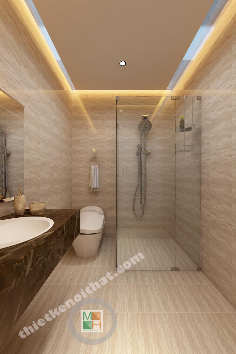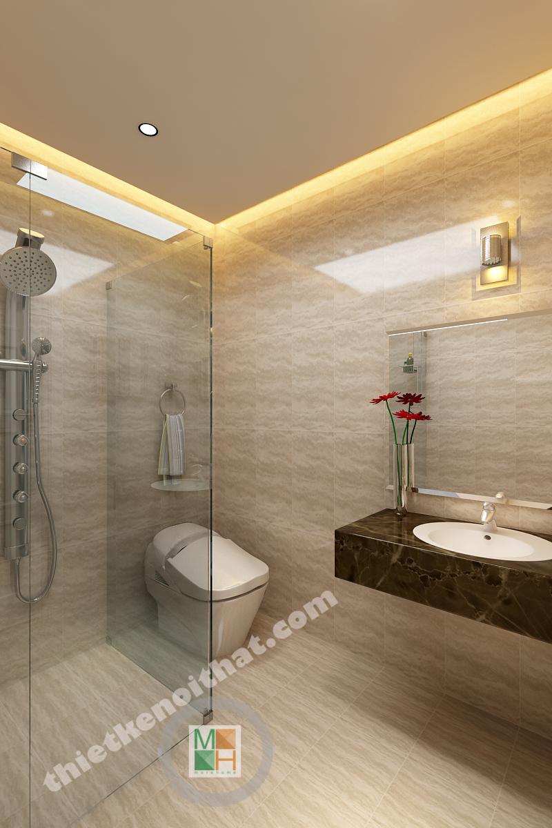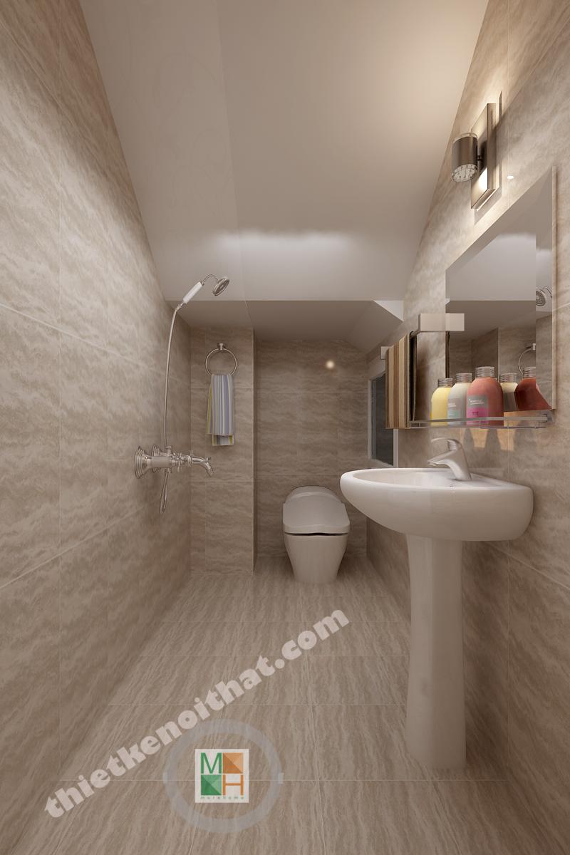 Phòng tắm ở lầu một và lầu hai có diện tích bằng nhau và đều sử dụng đá lát sáng màu nhằm tạo cảm giác sạch sẽ. Phòng tắm ở lầu hai được đầu tư hơn với bồn tắm đứng có kính ngăn trong suốt. Mảng kính này không những ngăn nước bắn mà còn khiến không gian trông tinh tế hơn.