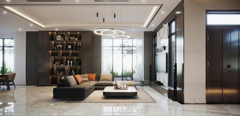 Một mẫu thiết kế phòng khách hiện đại với nội thất gỗ óc chó đẹp và sang trọng được áp dụng cho các căn hộ, nhà phố và biệt thự.