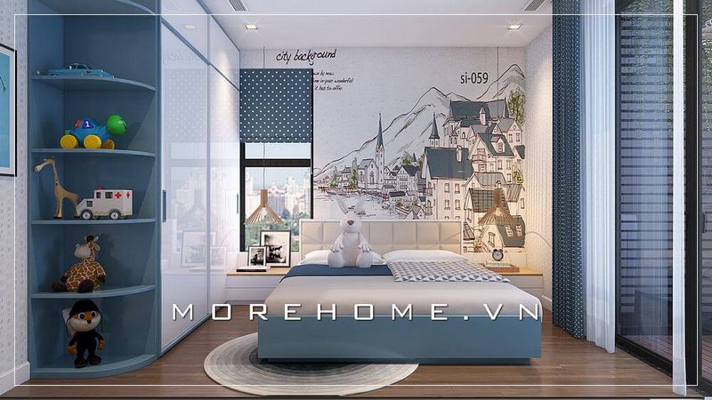Thiết kế nội thất phòng ngủ hiện đại cho bé trai bằng cách sử dụng tranh dán tường thành phố sẽ tạo nên cảm giác năng động và cá tính hơn bao giờ hết.